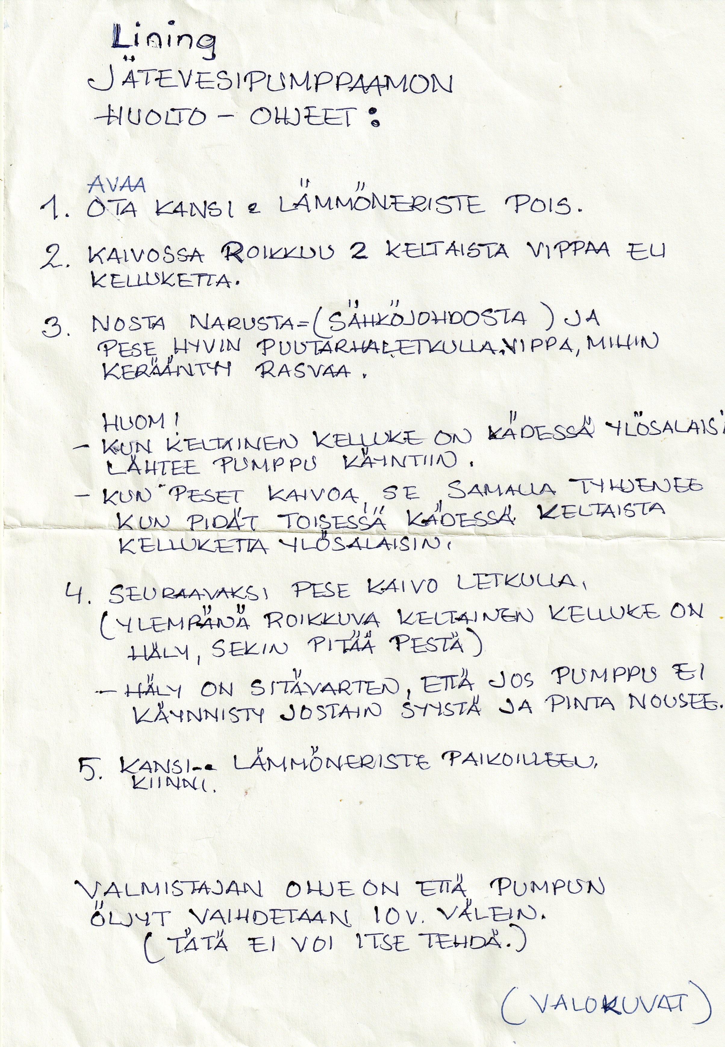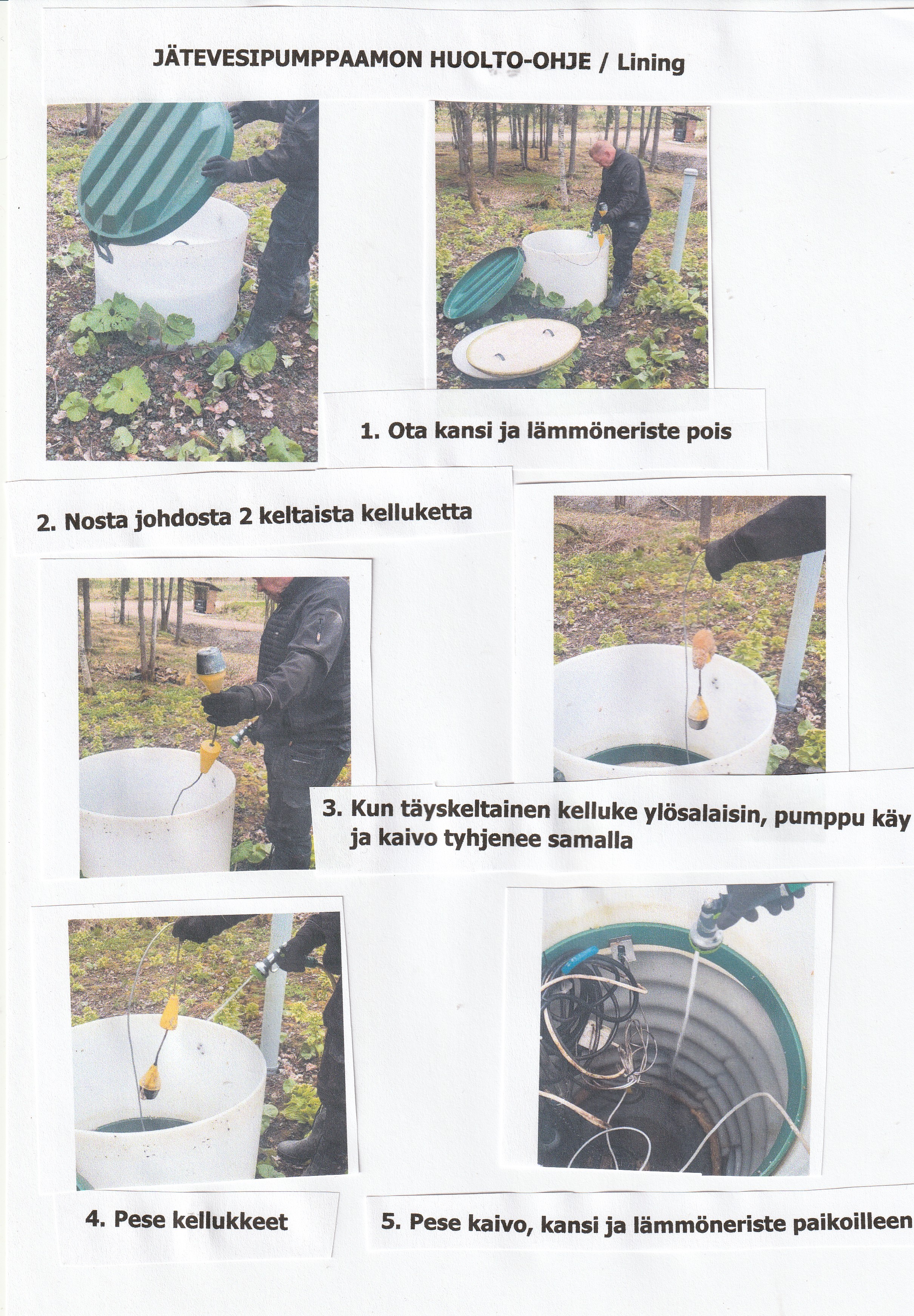JÄTEVESIPUMPPAAMON HUOLTO-OHJE/ Lining ¤ Vuosina 2015-16 saimme vihdoin liittyä kaupungin vesi- ja viemäriverkkoon. Omakotiyhdistys oli tässä ratkaisevassa roolissa. ¤ Jouduimme jokainen omakotitalo ostamaan oman 3 metrisen jätevesipumppaamon kiinteistölle. Pumppaamot jäivät kiinteistönomistajan huollettavaksi. ¤ Ohessa on pumppaamon vuosihuollon ohje, joka on Mikael ja Marianne Pfauderin käsialaa ja valokuvaa. ¤ Kymmenen vuoden välein pumpun öljyt tulee vaihtaa ammattihenkilön toimesta. Eli viimeistään ensi vuonna 2026 ! Omakotiyhdistys yrittää sopia yhteistä öljynvaihdon diiliä.